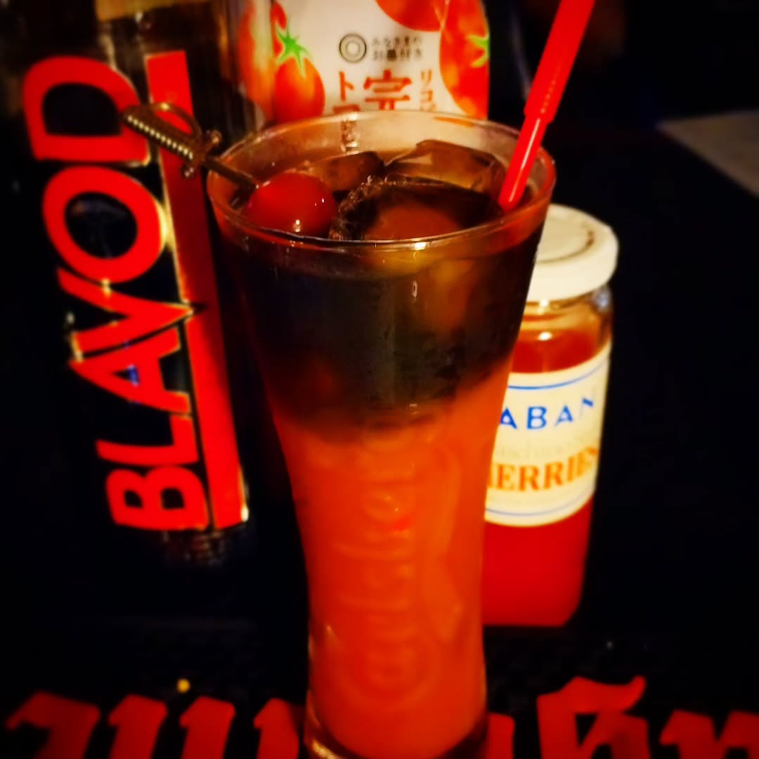 【ドリンク紹介】シャア専用ザク(「機動戦士ガンダム」より)トマトジュース+ブラヴォド+マラスキーノチェリー漫画家の柳原満月さん直伝。赤いボディに黒地に赤モノアイ、隊長機角は赤いマドラーで表現。混ぜないブラッディマリー、これはなかなかです!#オタクバー #柳原満月 #ドリンク紹介 #お酒紹介 #カクテル紹介 #オリジナルカクテル #イメージカクテル #機動戦士ガンダム #シャアザク #シャア専用ザク