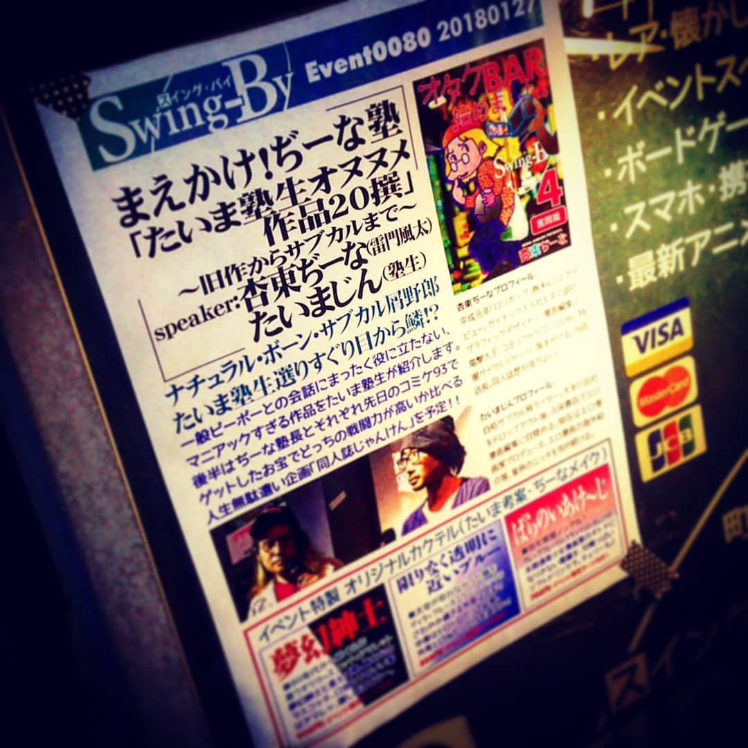 本日は #オタク #トークショー #イベント 、まえかけ!ぢーな塾「たいま塾生オヌヌメ20撰」19時からチャージ1000円(1drink付) #同人誌じゃんけん やります! #オタクバー