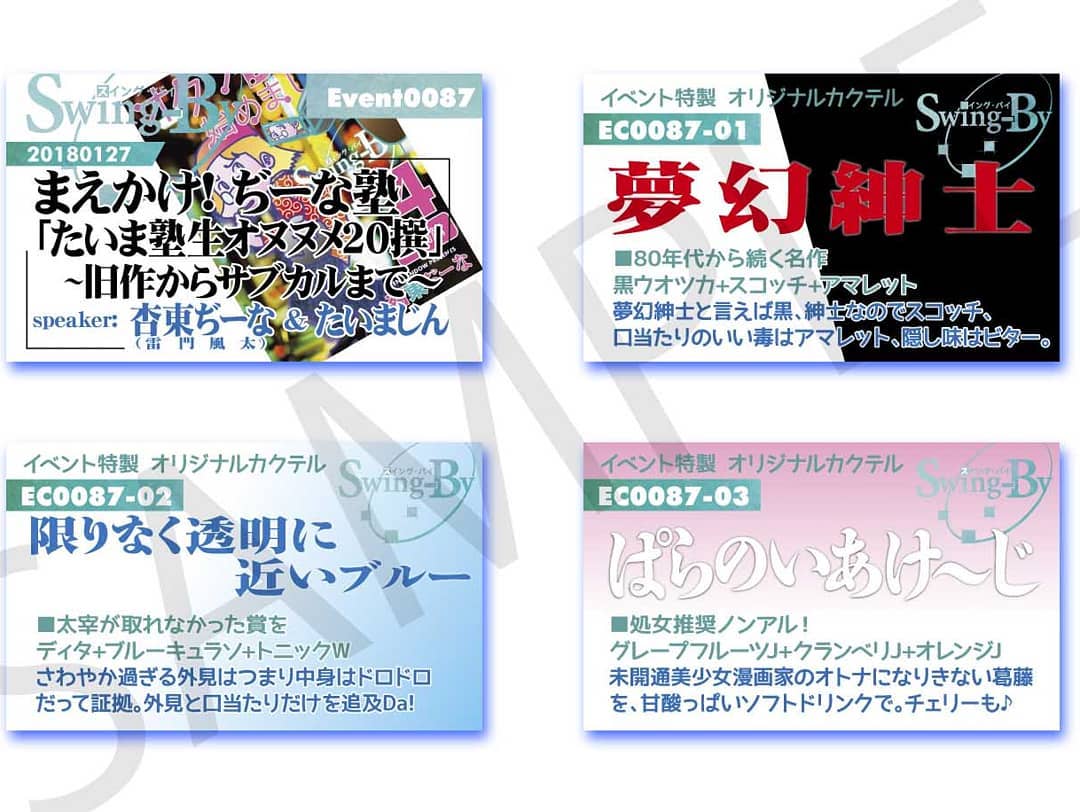 1/27 ぢーな塾「たいま塾生オヌヌメ20撰」 #イベント カードとオリジナル #カクテル カードです。カクテルは後日も作りますが、カードは当日のみの配布となります、お気を付けください。 #トークショー #オタクバー900円(強) #夢幻紳士 ウオッカ+スコッチ+アマレット800円(爽) #限りなく透明に近いブルー ディタ+ブルーキュラソー+トニックW700円(ノンアル) #ぱらのいあけ〜じ グレフルJ+クランベリJ+オレンジJ