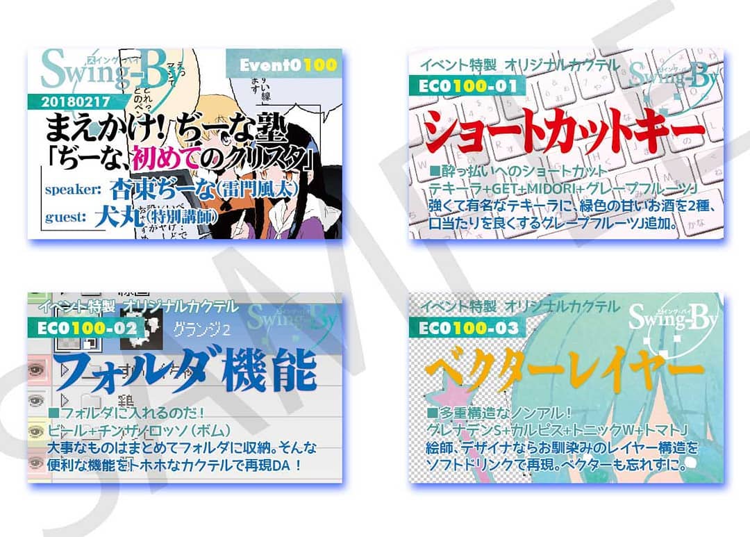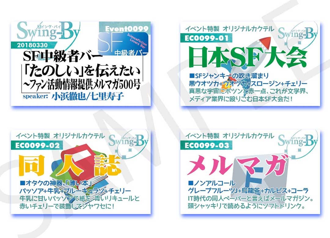 3/30 #SF 中級者カフェ「 「楽しい」を伝えたい」 #トークショー #イベントイベントカードとオリジナル #カクテル カード。カクテルは後日も作りますが、カードは当日のみの配布、ご注意ください。900円(強め) #日本SF大会 800円(爽やか) #同人誌 700円(ノンアル) #メルマガ #オタクバー