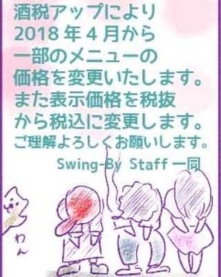 #酒税アップ により2018年4月から一部の #メニュー の価格を変更いたします。また表示価格を税抜から税込に、メンバーズカードの割引率も変更いたします。ご理解よろしくお願いします。Swing-By Staff一同#オタクバーhttp://swing-by.tokyo/drink/
