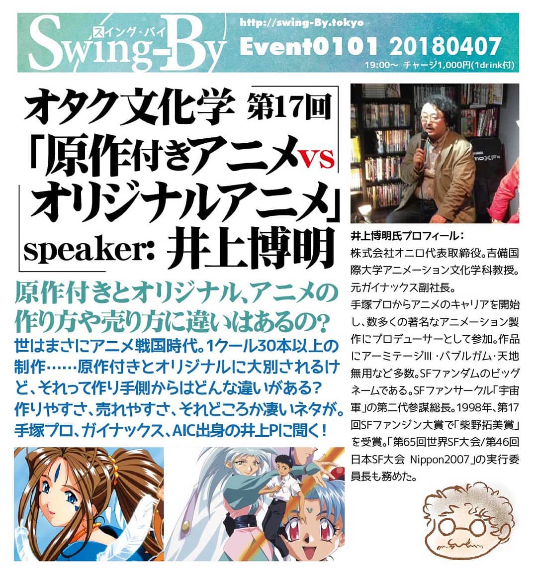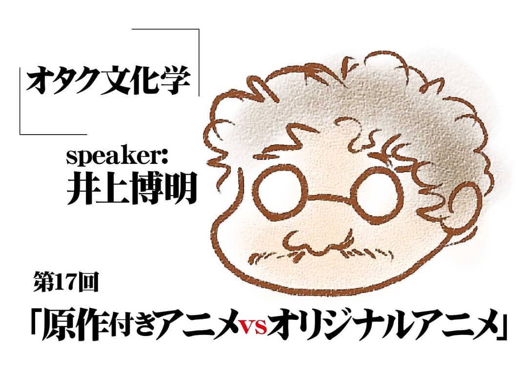 4/7 19時~ 1,000円(1ドリンク付)#オタク 文化学 第17回「原作付き #アニメ vs #オリジナルアニメ 」 #井上博明 原作付きとオリジナル、アニメの作り方や売り方に違いはあるの?世はまさにアニメ戦国時代。1クール30本以上の制作……原作付きとオリジナルに大別されるけど、それって作り手側からはどんな違いがある? 作りやすさ、売れやすさ、それどころか凄いネタが。 #手塚プロ 、 #ガイナックス 、 #AIC 出身の井上Pに聞く!井上博明氏プロフィール: 株式会社オニロ代表取締役。 #吉備国際大学 アニメーション文化学科教授。元ガイナックス副社長。手塚プロからアニメのキャリアを開始し、数多くの著名なアニメーション製作にプロデューサーとして参加。作品に #アーミテージⅢ ・ #バブルガム ・ #天地無用 など多数。SFファンダムのビッグネームである。SFファンサークル「 #宇宙軍 」の第二代参謀総長。1998年、第17回 #SF ファンジン大賞で「 #柴野拓美 賞」を受賞。「第65回世界SF大会/第46回日本SF大会 #Nippon2007 」の実行委員長も務めた。