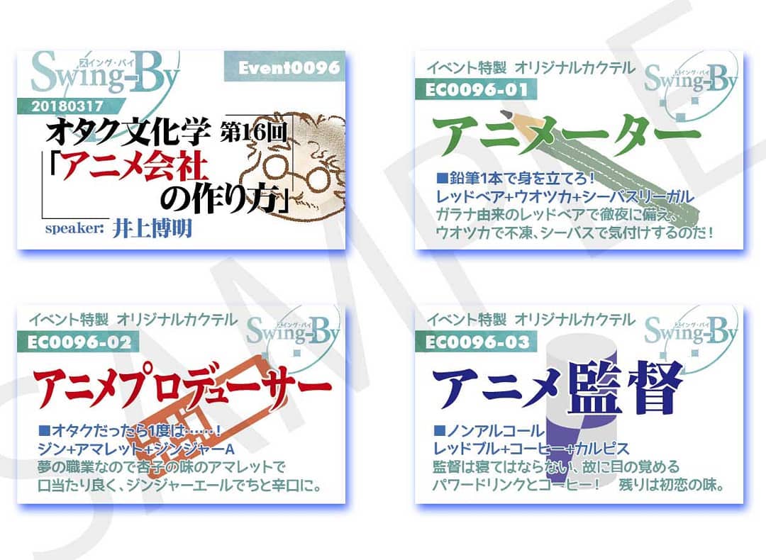 3/17 井上博明P オタク文化学16「 #アニメ会社 の作り方」 #トークショー #イベントイベントカードとオリジナル #カクテル カード。カクテルは後日も作りますが、カードは当日のみの配布、ご注意ください。900円(強め) #アニメーター800円(爽やか) #アニメプロデューサー700円(ノンアル) #アニメ監督#オタクバー