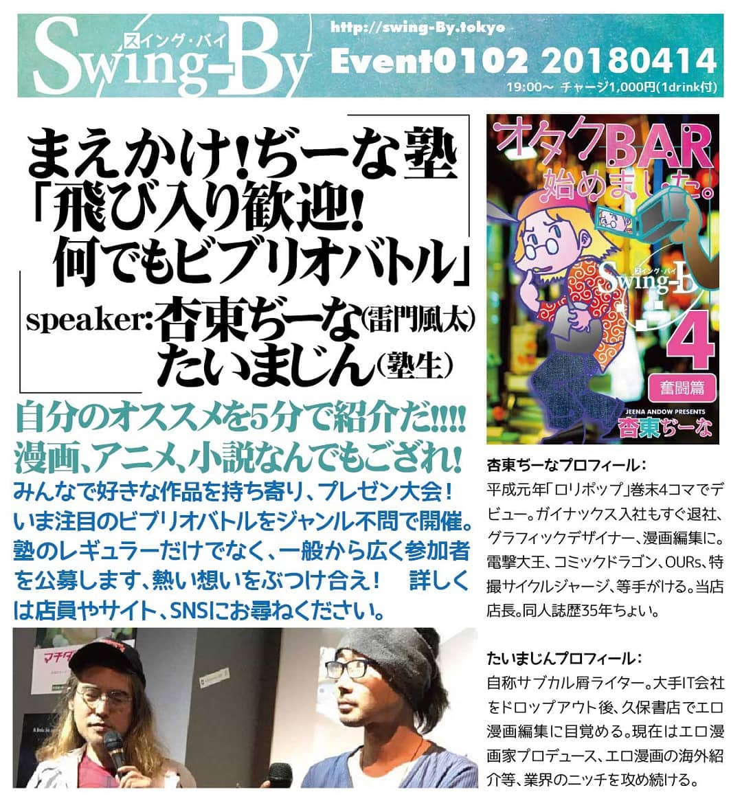 4/17 まえかけ!ぢーな塾「飛び入り歓迎!何でも #ビブリオバトル 」19時~ 1,000円(1ドリンク付) #オタクバーspeaker:杏東ぢーな(雷門風太)/たいまじん(塾生)自分のオススメを5分で紹介だ!!!! #漫画 、 #アニメ 、 #小説 なんでもござれ!みんなで好きな作品を持ち寄り、 #プレゼン 大会! いま注目のビブリオバトルをジャンル不問で開催。塾のレギュラーだけでなく、一般から広く参加者を公募します、熱い想いをぶつけ合え! 詳しくは店員や公式サイト、SNSにお尋ねください。杏東ぢーなプロフィール: 平成元年「 #ロリポップ 」巻末4コマでデビュー。 #ガイナックス 入社もすぐ退社、グラフィックデザイナー、漫画編集に。 #電撃大王 、 #コミックドラゴン# 、 #OURs 、 #特撮 #サイクルジャージ 等手がける。当店店長。同人誌歴35年ちょい。たいまじんプロフィール: 自称 #サブカル 屑ライター。大手IT会社をドロップアウト後、 #久保書店 でエロ漫画編集に目覚める。現在は #エロ漫画家 プロデュース、 #エロ漫画 の海外紹介等、業界のニッチを攻め続ける。