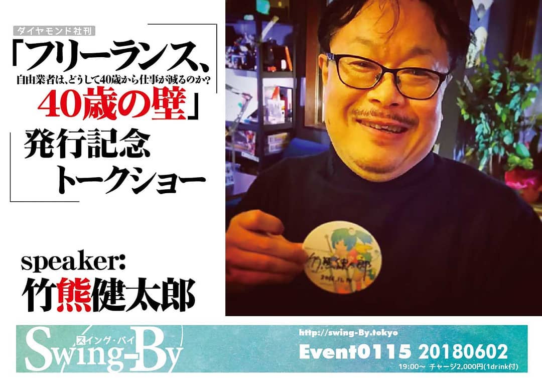 #竹熊健太郎氏「 #フリーランス 、 #40歳の壁 」発行記念トークショーSpeaker: 竹熊健太郎 チャージ2,000円(1drink付き)発売から話題騒然!!!! 筆者の竹熊氏が語るフリーランスの実態1989年「 #サルまん 」で漫画業界に綺羅星の如く輝いた竹熊健太郎氏。時代の寵児として無敵に思えたそのフリーランス活動に、かげろうの様に現れたほの暗い”かげり”とは……? 本の内容を紹介しつつ、その『40歳の壁』について語って頂きます。トークショー終了後に #対面販売 、 #サイン会 あります、お楽しみに。竹熊健太郎プロフィール: 1960年、東京生まれ。編集家・フリーライター。 #多摩美術大学#非常勤講師。高校時代に作ったミニコミ(同人誌)がきっかけで、1980年からフリーランスに。1989年に #小学館 #ビッグコミックスピリッツ で #相原コージ と連載した『サルまん #サルでも描けるまんが教室 』が代表作になる。以後、 #マンガ原作 ・ #ライター業 を経て、2008年に #京都精華大学 #マンガ学部 の専任教授となり、これが生涯唯一の「就職」になるが、2015年に退職。同年、 #電脳マヴォ 合同会社を立ち上げ、代表社員になる。(『フリーランス、40歳の壁』より)