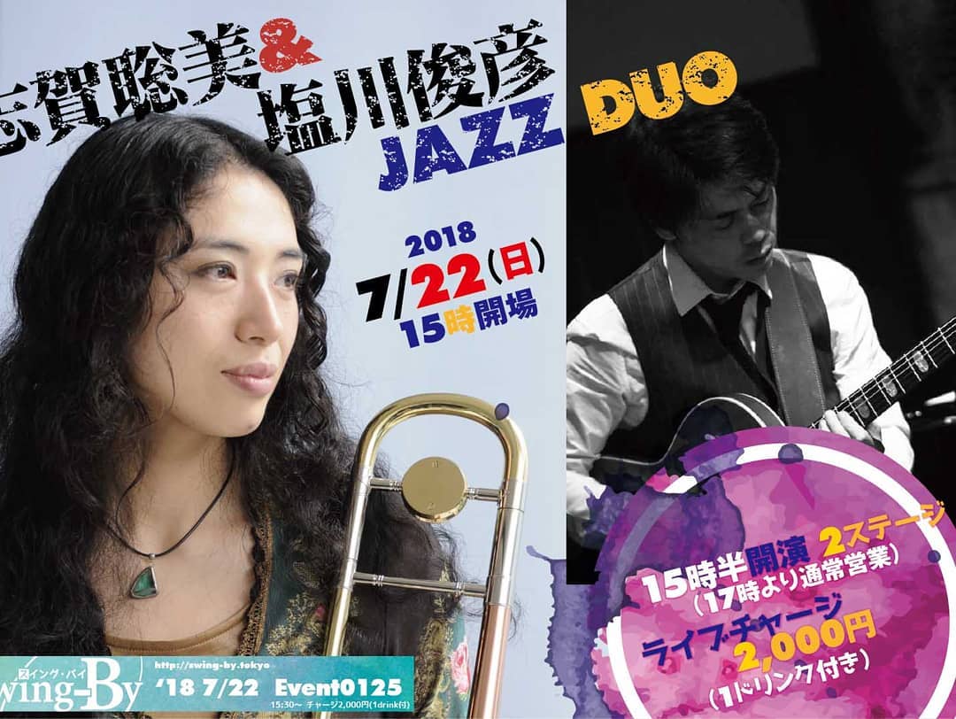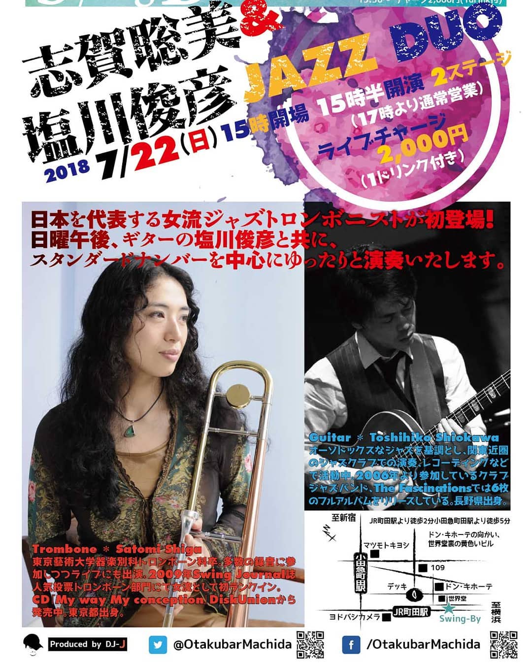 #志賀聡美 & #塩川俊彦 #JAZZ DUO7/22(日)15時開場 15時半開演 2ステージ(17時より通常営業)ライブチャージ2000円(1ドリンク付き) http://bit.ly/2Kohi9q 日本を代表する #女流ジャズトロンボニスト が初登場。日曜午後、 #ギター の塩川俊彦と共に、 #スタンダードナンバー を中心にゆったりと演奏いたします。Powered by DJ-J #オタクバー Trombone * Satomi Shiga#東京藝術大学 器楽別科トロンボーン科卒。多数の録音に参加しつつライブにも出演。2009年 #SwingJournal 誌人気投票 #トロンボーン 部門にて女流として初ランクイン。CD『My way My conception』 #DiskUnion から発売中。東京都出身。 Guitar * Toshihiko Shiokawaオーソドックスなジャズを基調とし、関東近圏の #ジャズクラブ での演奏、 #レコーディング などで活動中。2006年より参加している #クラブジャズバンド 、The Fascinations では6枚の #フルアルバム をリリースしている。長野県出身。