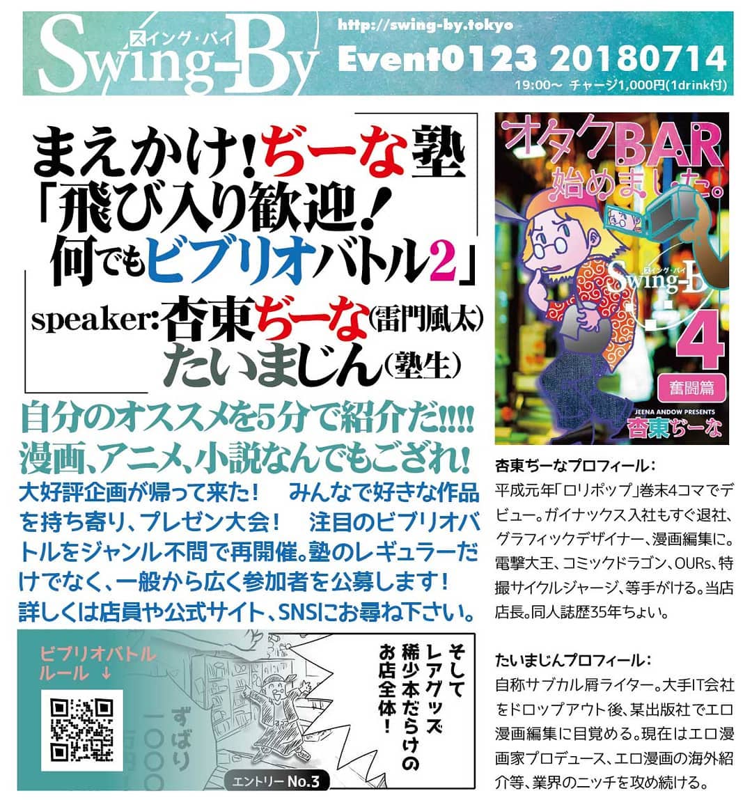 7/14 19時 まえかけ! #ぢーな塾 「飛び入り歓迎!何でも #ビブリオバトル 2」チャージ1,000円(1ドリンク付) http://bit.ly/2Kf5jM0 #オタクバー speaker: #杏東ぢーな ( #雷門風太 )/ #たいまじん (塾生)自分のオススメを5分で紹介だ!!!! 漫画、アニメ、小説なんでもござれ!大好評企画が帰って来た! みんなで好きな作品を持ち寄り、プレゼン大会!注目のビブリオバトルをジャンル不問で再開催。塾のレギュラーだけでなく、一般から広く参加者を公募します! 詳しくは店員や公式サイト、SNSにお尋ね下さい。★ビブリオバトル説明 http://bit.ly/2JfcAHF杏東ぢーなプロフィール:平成元年「 #ロリポップ 」巻末4コマでデビュー。#ガイナックス 入社もすぐ退社、 #グラフィックデザイナー、 #漫画編集 に。 #電撃大王 、 #コミックドラゴン 、 #OURs 、 #特撮サイクルジャージ 等手がける。当店店長。同人誌歴35年ちょい。たいまじんプロフィール:自称 #サブカル屑ライター 。大手IT会社をドロップアウト後、某出版社で #エロ漫画編集 に目覚める。現在は #エロ漫画家 プロデュース、エロ漫画の海外紹介等、業界のニッチを攻め続ける。