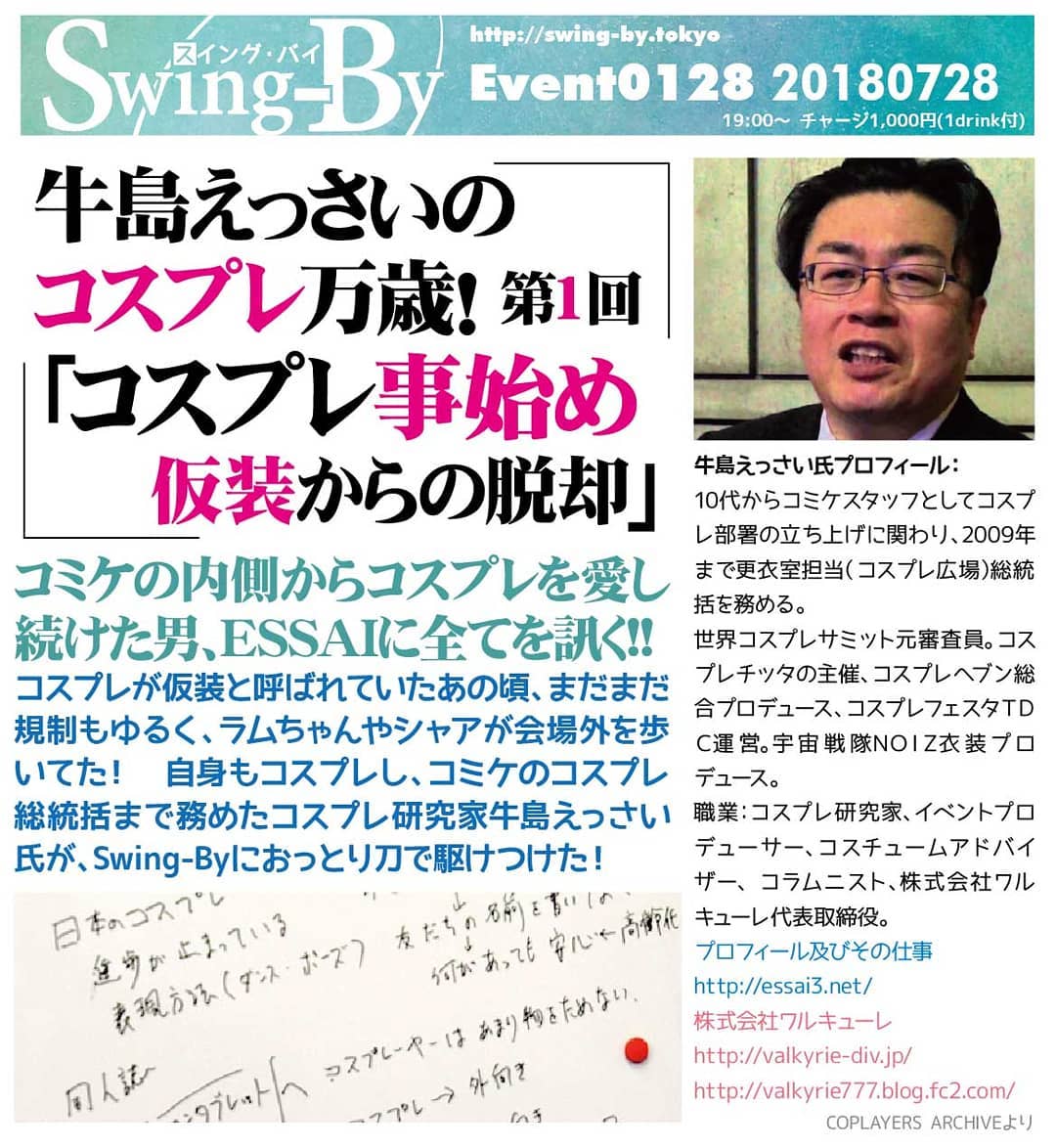 #牛島えっさい の #コスプレ万歳! 第1回「コスプレ事始め 仮装からの脱却」7/28 19時 1,000円(1drink付) http://bit.ly/2Ix3FzK #オタクバー speaker: 牛島えっさい#コミケ の内側から #コスプレ を愛し続けた男、ESSAIに全てを訊く!!コスプレが #仮装 と呼ばれていたあの頃、まだまだ規制もゆるく、 #ラム ちゃんや #シャア が会場外を歩いてた! 自身もコスプレし、コミケのコスプレ総統括まで務めた #コスプレ研究家 牛島えっさい氏が、Swing-Byにおっとり刀で駆けつけた!牛島えっさい氏プロフィール: 10代から #コミケスタッフ としてコスプレ部署の立ち上げに関わり、2009年まで更衣室担当(コスプレ広場)総統括を務める。 #世界コスプレサミット 元審査員。 #コスプレチッタ の主催、 #コスプレへブン 総合プロデュース、 #コスプレフェスタ TDC運営。 #宇宙戦隊NOIZ 衣装プロデュース。職業:コスプレ研究家、 #イベントプロデューサー 、 #コスチュームアドバイザー 、 # コラムニスト 、 #株式会社ワルキューレ 代表取締役。プロフィール及びその仕事 http://essai3.net/株式会社ワルキューレ http://valkyrie-div.jp/ http://valkyrie777.blog.fc2.com/COPLAYERS ARCHIVEより