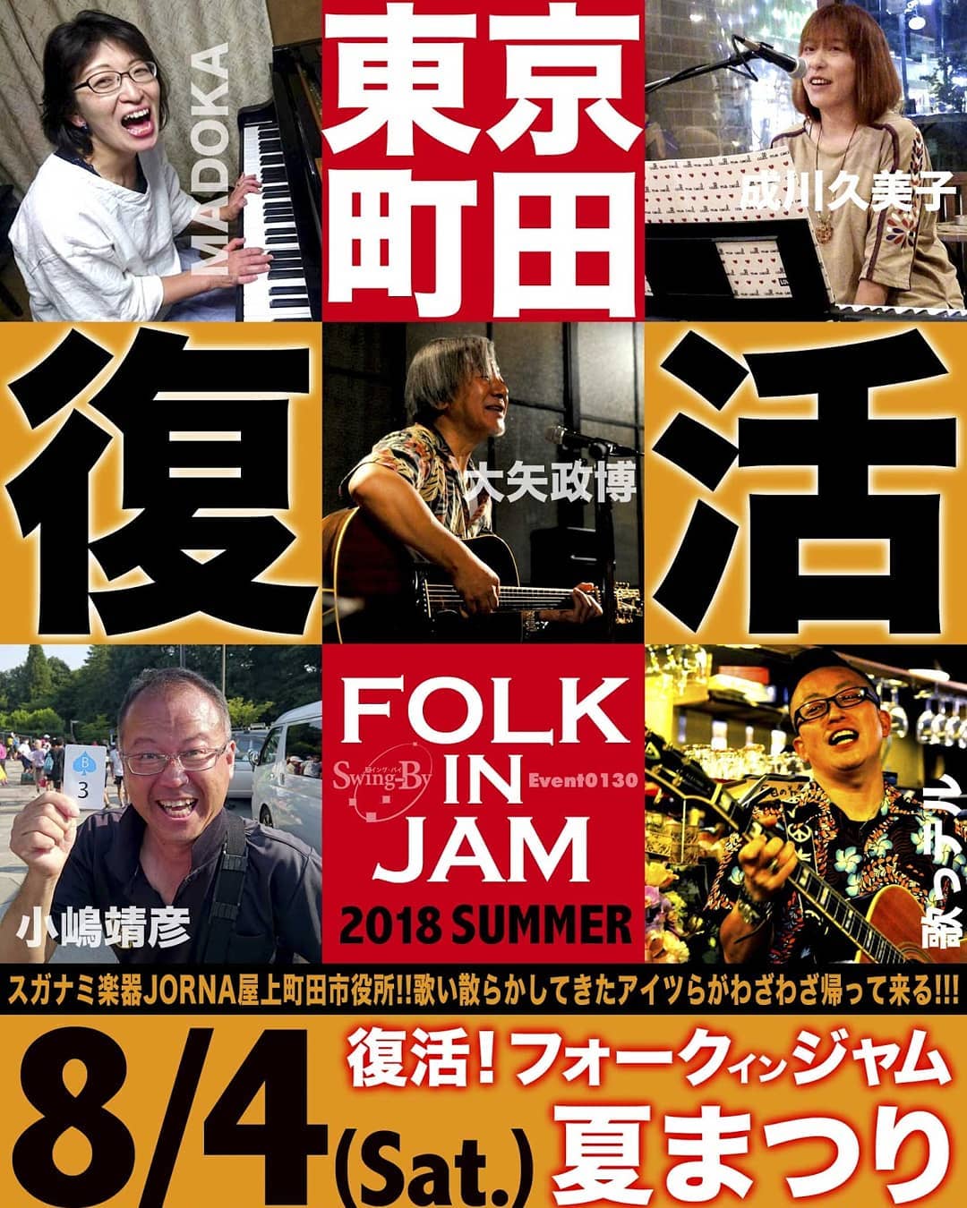 復活!! #フォークインジャム #夏祭り 8/4日(土) 開場16:00 開演17:00ライブチャージ2,000円(要1drink) #オタクバー http://bit.ly/2lBI7Zy1970〜1980年代に、 #小田急線 #町田駅 第2踏切近くの「 #スガナミ楽器 」には、 #町田 はもとより #相模原 、 #座間 、 #厚木 、 #海老名 から #フォークソング 好きが集うコミュニティ『 #フォーク・イン・ジャム 』がありました。高校生から30代の兄さん姐さんまで幅広い世代で構成されたその集団は、月に一度、楽器店の小ホールをはじめ #ジョルナ 屋上、 #町田市役所 でのまつりの櫓など、場所を選ばずあちこちで歌い散らかしてきました。今回、生誕の地・町田で一日限りの復活デス! 出演■ #大矢政博 #小嶋靖彦 #成川久美子 #歌っテル #madoka