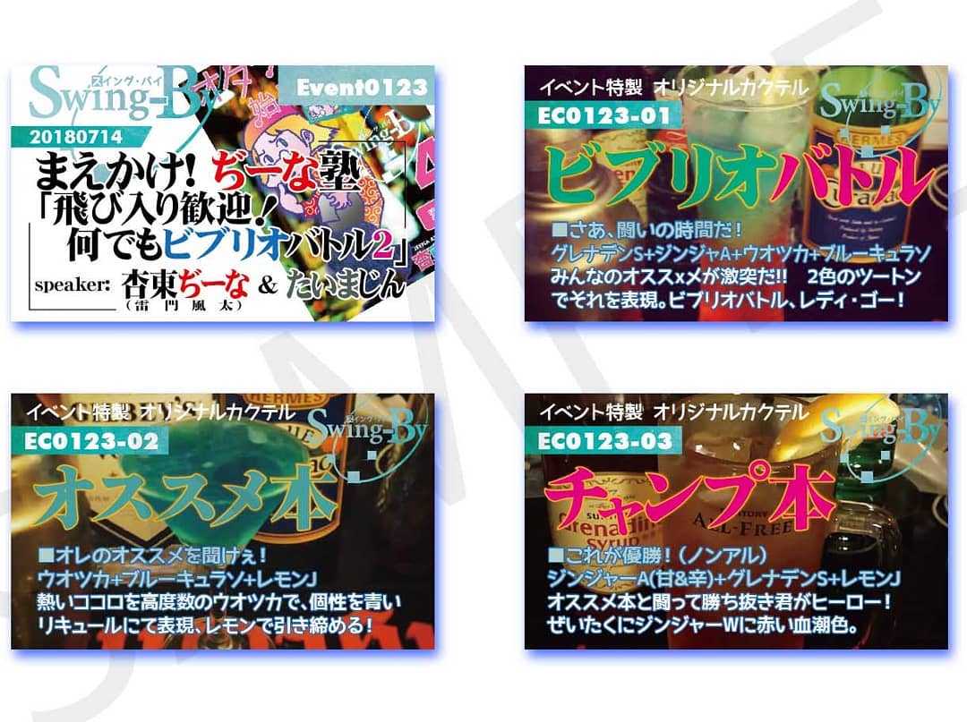 7/14 まえかけ! #ぢーな塾「何でも #ビブリオバトル 2」 http://bit.ly/2Kf5jM0 イベントカードとオリジナル #カクテル カード。カクテルは後日も作りますが、カードは当日のみの配布、ご注意ください。870円(爽やか) ビブリオバトル 980円(強め) #オススメ本 760円(ノンアル) #チャンプ本 #オタクバー