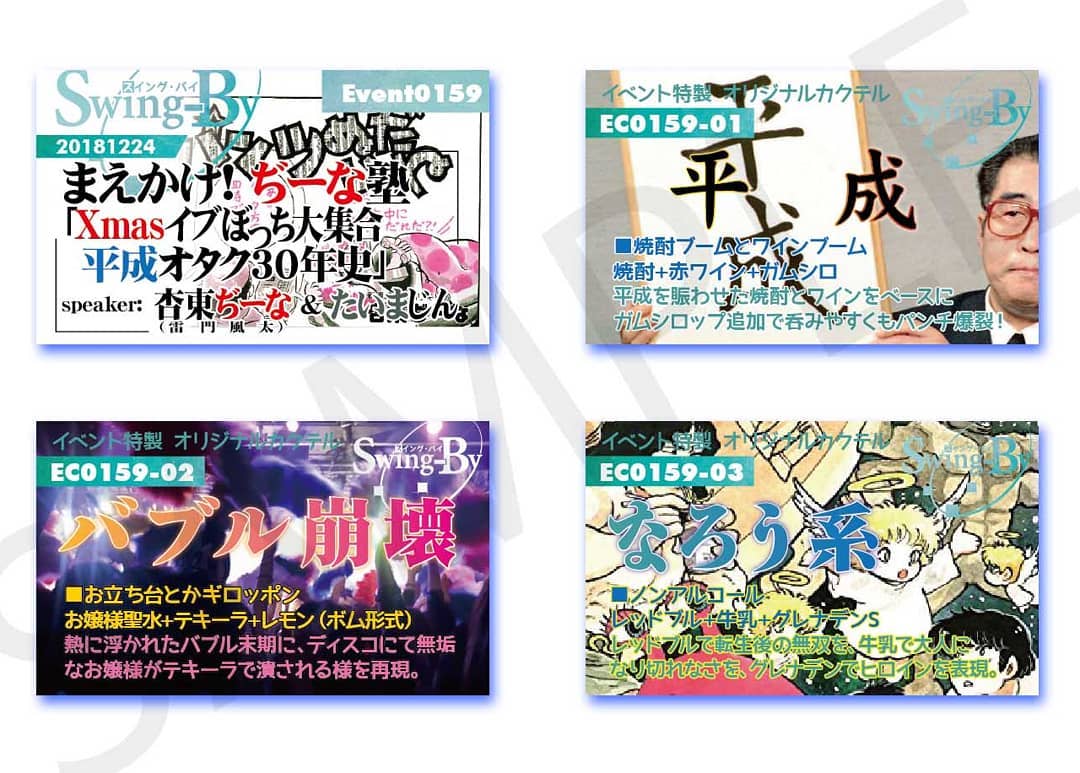 12/24 #まえかけ!ぢーな塾 「 #Xmasイブ #ぼっち大集合 #平成オタク30年史 」http://bit.ly/2AajdIh イベントカードとオリジナル #カクテル カード。カクテルは後日も作りますが、カードは当日のみの配布、ご注意ください。980円(強め) #平成 870円(爽やか) #バブル崩壊 760円(ノンアル) #なろう系 #オタクバー