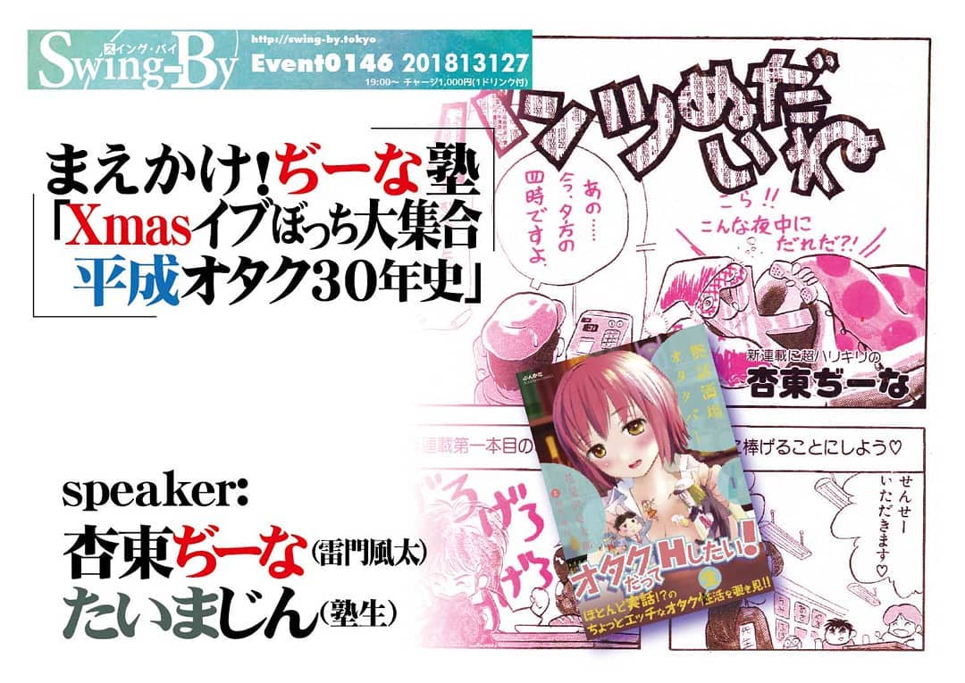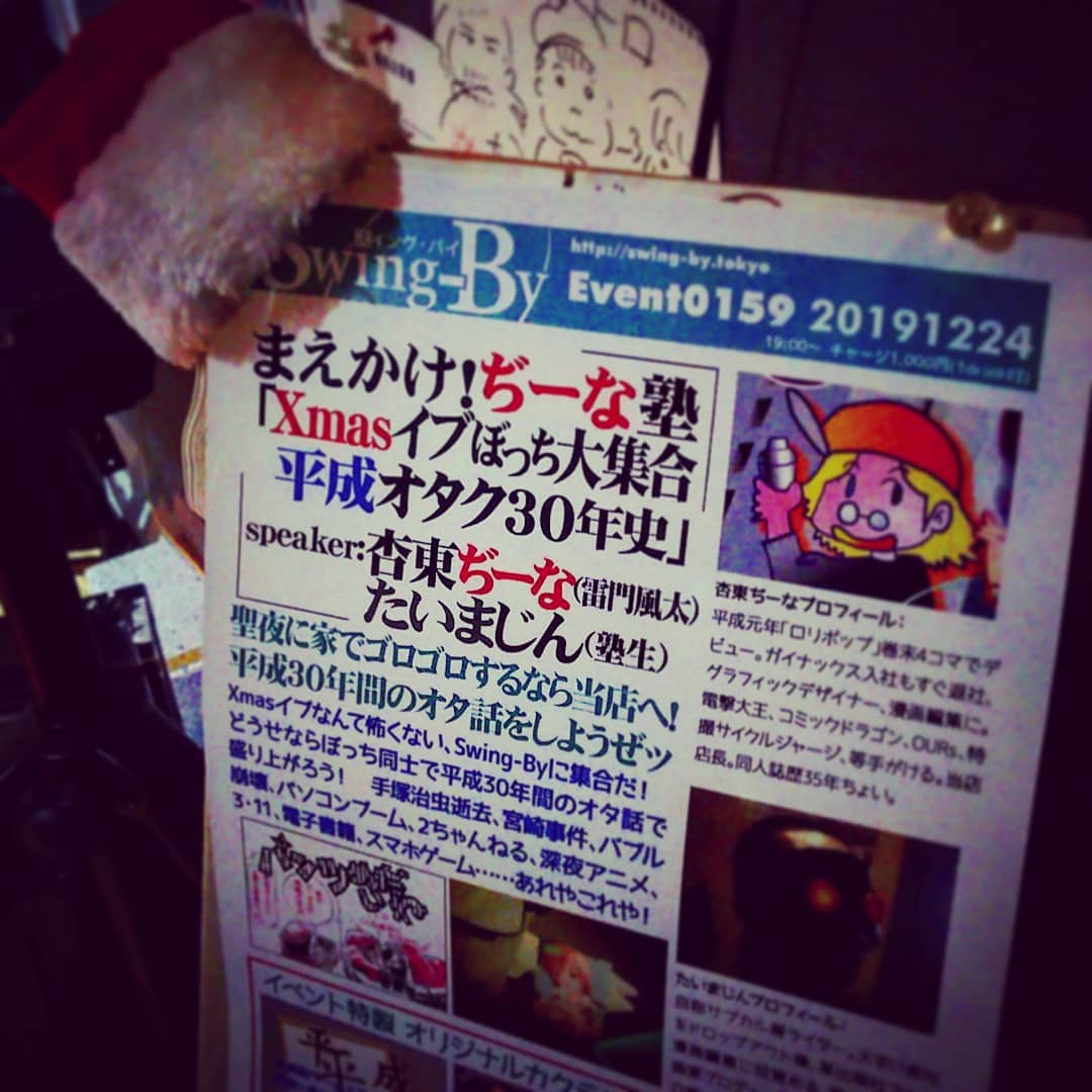 12/24 #まえかけ!ぢーな塾 「 #Xmasイブ #ぼっち大集合 #平成オタク30年史 」http://bit.ly/2AajdIh 19時~ 1,000円(1drink付) #オタクバー #聖夜 に家でゴロゴロするなら当店へ! #平成30年間 の #オタ話 をしようぜッ#Xmasイブ なんて怖くない、Swing-Byに集合だ! どうせなら #ぼっち同士 で平成30年間のオタ話で盛り上がろう! #手塚治虫 逝去、宮崎事件、 #バブル崩壊 、パソコンブーム、 #2ちゃんねる 、 #深夜アニメ 、 #3・11 、 #電子書籍 、 #スマホゲーム ……あれやこれや!#杏東ぢーな プロフィール: 平成元年「 #ロリポップ 」巻末4コマでデビュー。 #ガイナックス 入社もすぐ退社、 #グラフィックデザイナー 、 #漫画編集 に。 #電撃大王 、 #コミックドラゴン 、 #OURs 、 #特撮サイクルジャージ 等手がける。当店店長。 #同人誌 歴35年ちょい。#たいまじん プロフィール: 自称 #サブカル屑ライター 。大手IT会社をドロップアウト後、某出版社で #エロ漫画編集 に目覚める。現在は #エロ漫画家プロデュース 、エロ漫画の海外紹介等、業界のニッチを攻め続ける。