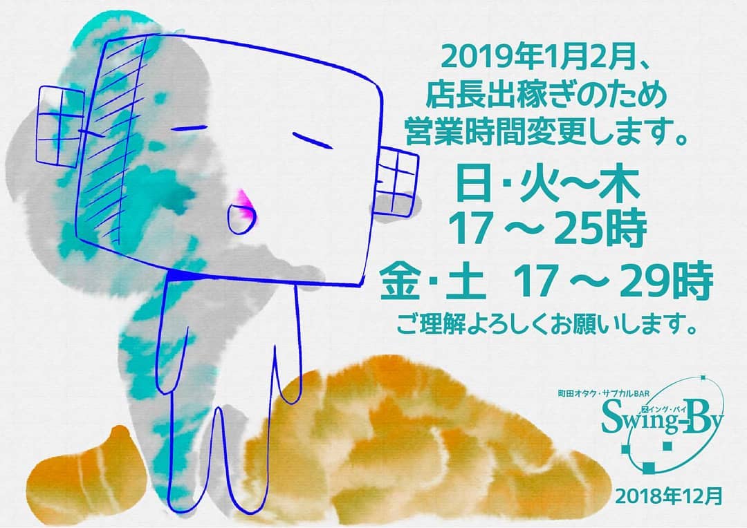 2019年1月2月、#店長 #出稼ぎ のため営業時間変更します。日・火~木:17~25時 金・土 17~29時ご理解よろしくお願いします。 #オタクバー