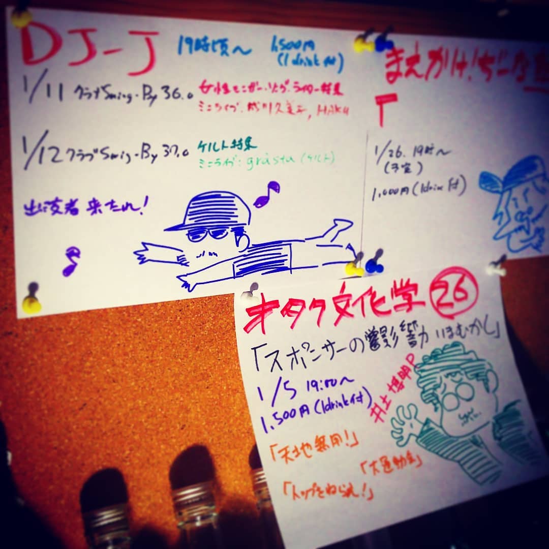 1月の #イベント 5日 #井上博明 P #オタク文化学 「 #スポンサー の影響力」、 #DJ-J 11日 #女性シンガーソングライター 特集 #ミニライブ #成川久美子 #HAKU 12日 #ケルト 特集 ミニライブ #arasta 、26日 #まえかけ! #ぢーな塾 内容未定 #オタクバー