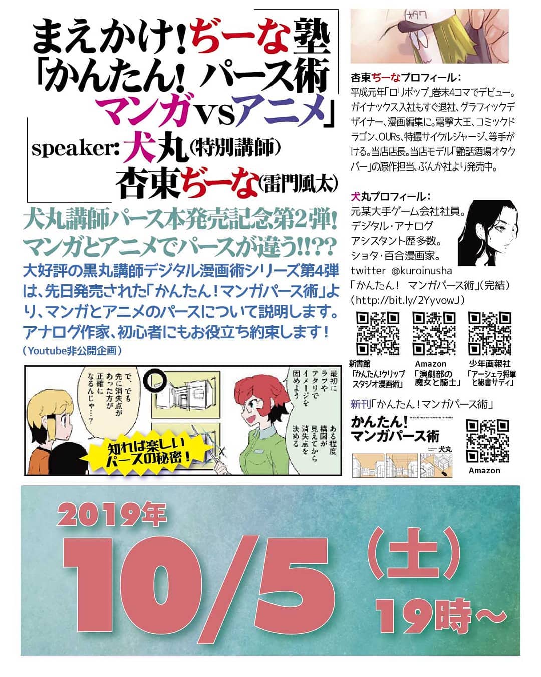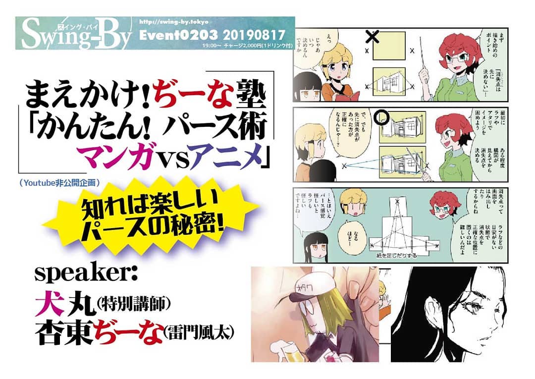 '19 10/05 まえかけ! #ぢーな塾「かんたん!# パース術 #マンガ vs #アニメ」 http://bit.ly/2ouqMXj 19時~ 2,000円(1drink付)Speaker: #犬丸(特別講師)、#杏東ぢーな(#雷門風太)#犬丸講師 #パース本 発売記念第2弾! マンガとアニメでパースが違う!!??大好評の犬丸講師 #デジタル漫画術 シリーズ第4弾は、先日発売された「#かんたん!マンガパース術」より、マンガとアニメのパースについて説明します。#アナログ作家、#初心者 にもお役立ち約束します!(#Youtube非公開企画)犬丸プロフィール: 元某大手ゲーム会社社員。デジタル・アナログアシスタント歴多数。#ショタ百合漫画家。twitter @kuroinusha「かんたん! マンガパース術」(完結)(http://bit.ly/2YyvowJ)杏東ぢーなプロフィール: 平成元年「ロリポップ」巻末4コマでデビュー。ガイナックス入社もすぐ退社、グラフィックデザイナー、漫画編集に。電撃大王、コミックドラゴン、OURs、特撮サイクルジャージ、等手がける。当店店長。同人誌歴35年ちょい。