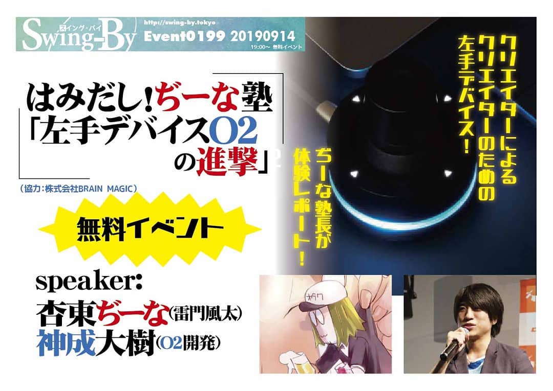 '19 9/14 はみだし! #ぢーな塾「#左手デバイスO2の進撃」 http://bit.ly/2lEDPnm 19時~ 無料イベントSpeaker:#杏東ぢーな(#雷門風太)、#神成大樹(O2開発)#クリエイターのための左手デバイス #O2 降臨! 使い勝手を塾長が報告#イラストレーター が開発した #高スペック左手デバイス #Orbital2(O2)を #デザイナー、#漫画家 でもある #ぢーな塾長 が身をもって体験! 開発者の神成大樹氏も登壇、ハイパーな利用法や開発秘話を明かします!(協力:#株式会社BRAIN MAGIC)神成大樹プロフィール: #BRAINMAGIC 代表。1989年奈良県出身。#デジタルハリウッド大学院 卒、#デジタルコンテンツマネジメント修士。中学生のとき #3DCG によるイラストを描きはじめ、高校時代よりフリーランスのイラストレーター、デザイナーとして仕事をはじめる。2012年、友人とともに立ち上げた株式会社B.C.Membersの取締役に就任。2016年、株式会社BRAIN MAGICを設立。現在、特別講師として小学校や大学にてキャリア教育の公演も行う。#クリエイティブ、#テクノロジー、#エデュケーション の三つをミッションに掲げ日々邁進中。Orbital2 portal http://brainmagicportal.com杏東ぢーなプロフィール: 平成元年「ロリポップ」巻末4コマでデビュー。ガイナックス入社もすぐ退社、グラフィックデザイナー、漫画編集に。電撃大王、コミックドラゴン、OURs、特撮サイクルジャージ、等手がける。当店店長。同人誌歴35年ちょい。