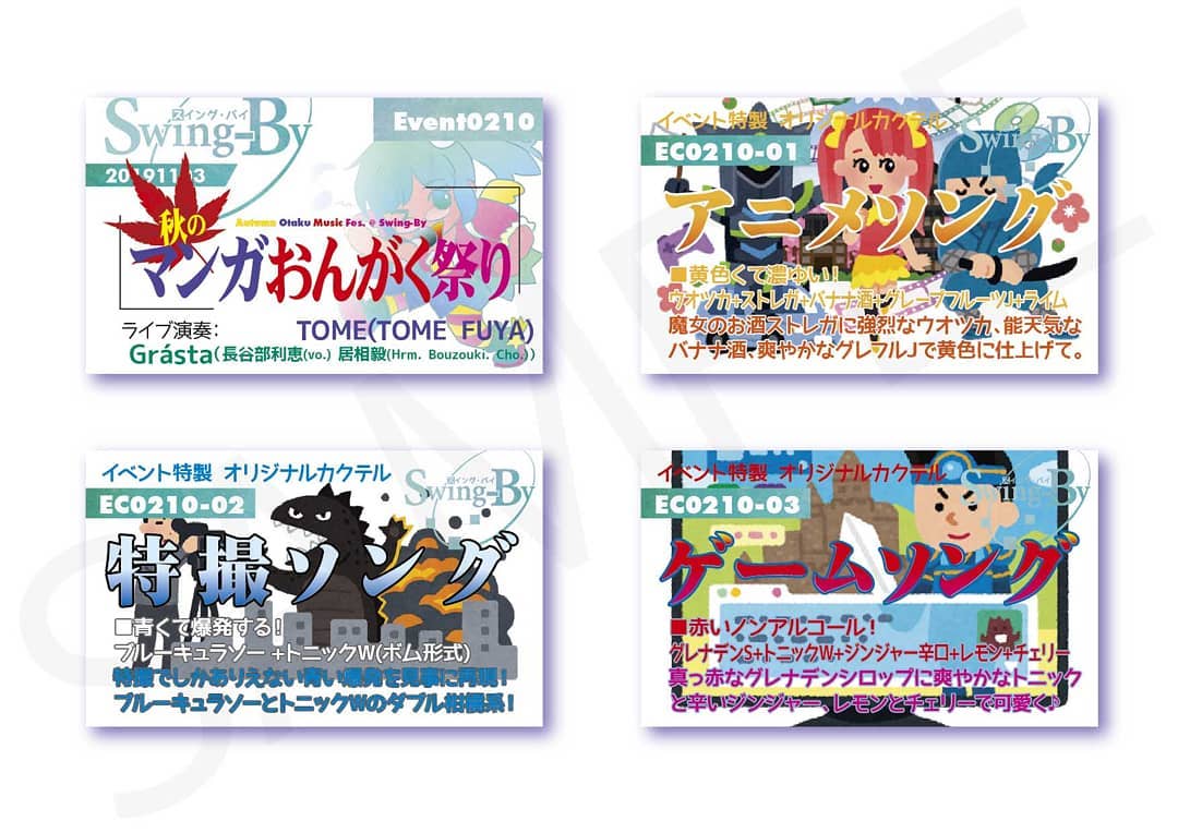 '19 11/3 19時半~ 秋のマンガおんがく祭り A面http://bit.ly/35YjHiT #オタクバー990円(強め) #アニメソング 880円(爽やか) #特撮ソング 770円(ノンアル) #ゲームソング