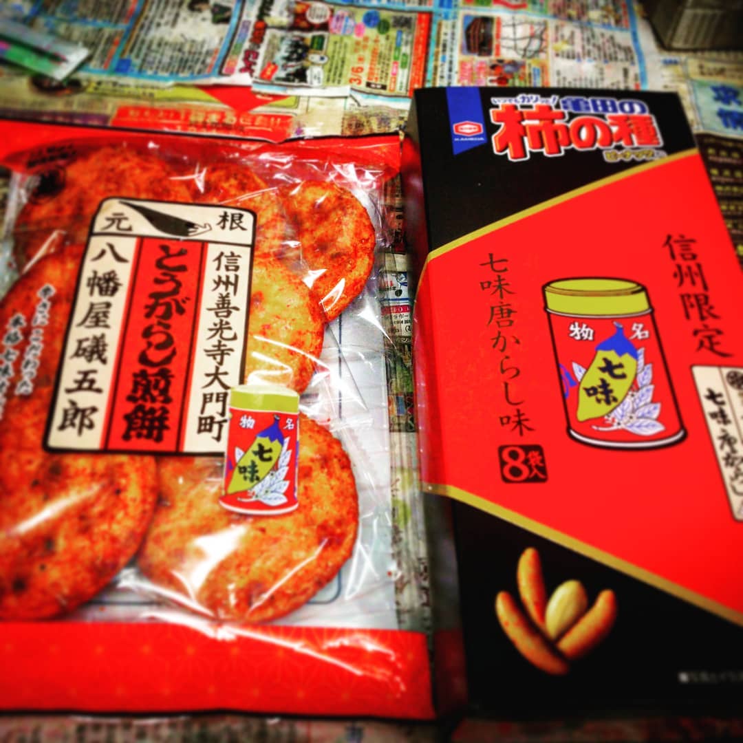 常連さんの #新潟お土産、#八幡屋礒五郎 の #とうがらし煎餅 と #柿の種七味唐からし味! 早いもの順です。…