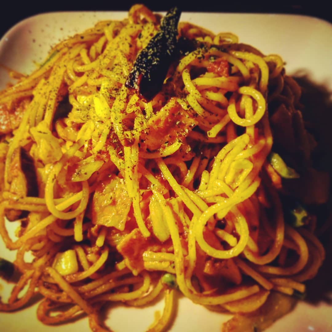 まかない #激辛 #カレー風味 #ミートソースパスタ。もうちょっとスパイシーに、してもいいなかな。#オタクバー
