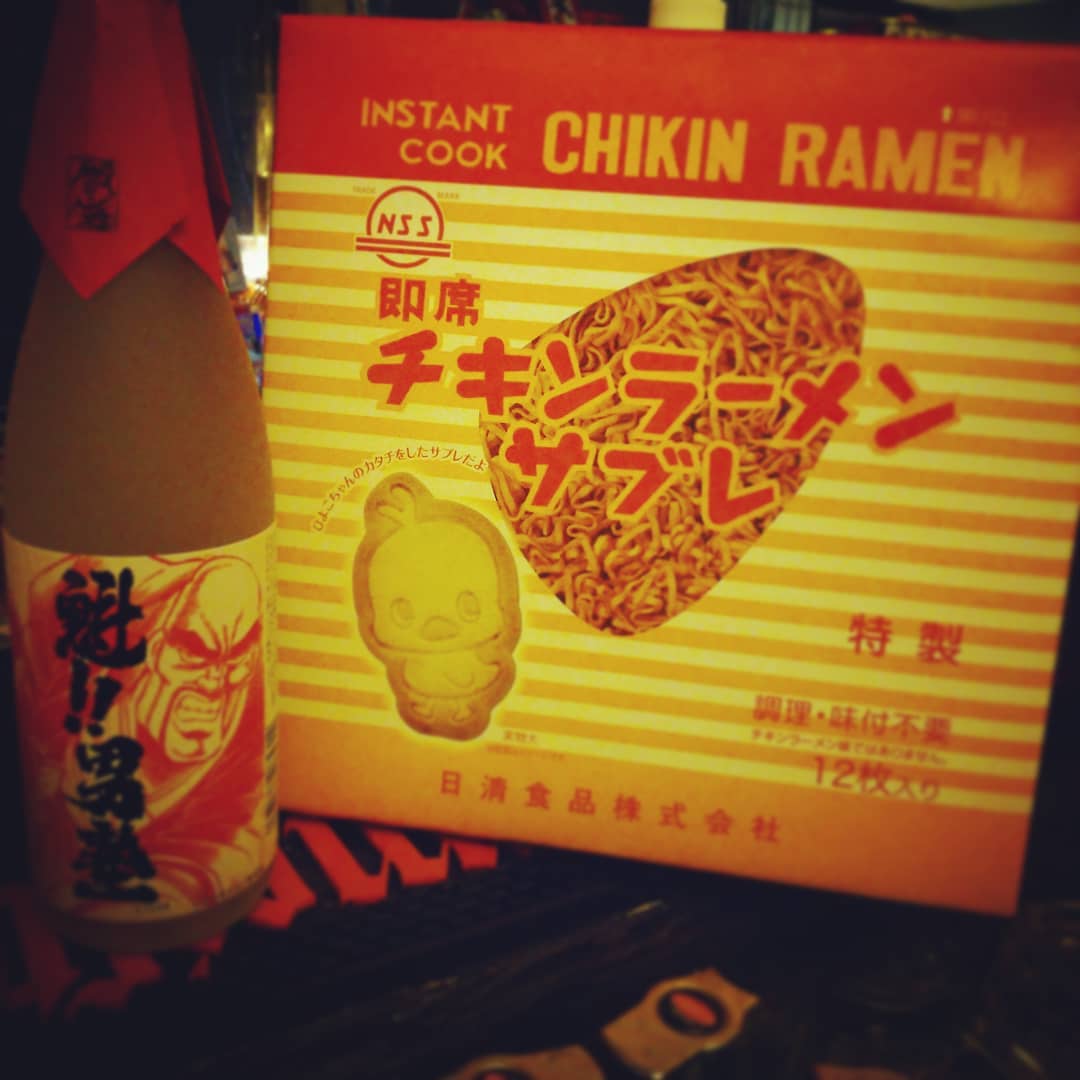常連さんのお土産、#魁男塾焼酎、#チキンラーメンサブレ。あざっす! #オタクバー