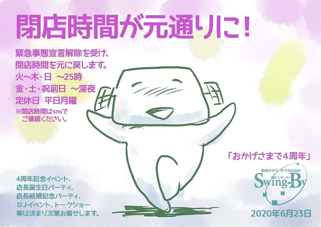 【閉店時間元通りのお報せ】#緊急事態宣言解除を受け、閉店時間を元に戻します。火~木・日25時まで 金・土・祝前日深夜まで 平日月曜定休。(開店時間はsnsをご確認ください)※4周年記念イベント、店長誕生日パーティ、店長結婚記念パーティ、DJイベント、トークショー�等は決まり次第お報せします。2020年6月23日 「おかげさまで4周年」オタク・サブカルBAR Swing-By 店長・雷門風太 #オタクバー #新型コロナウィルス