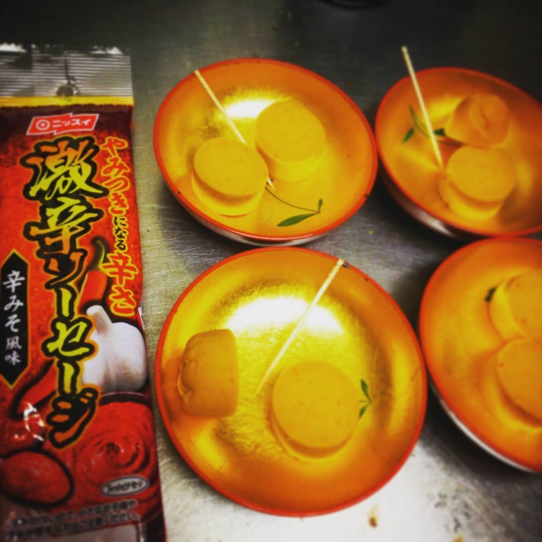 #常連さん お土産、#ニッスイ #激辛ソーセージ辛みそ味。#キャロライナリーパー パウダーを持ってきた御仁なので身構えたらピリ辛……。#オタクバー