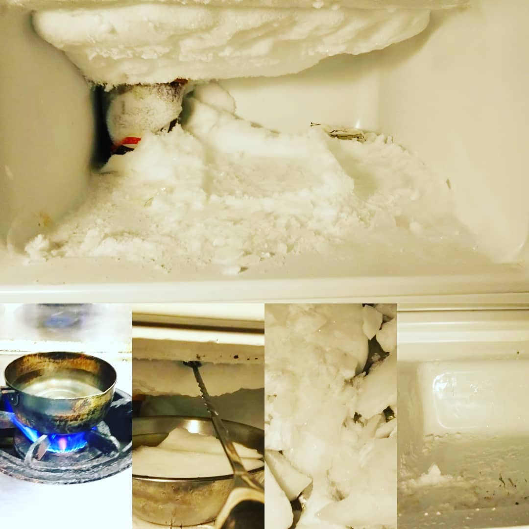 月曜定休日、ホール側の冷蔵庫の霜取りをしました。電源オフし熱湯を容れたボウルを入れて5分。カクテルフォークで気持ちいいほど剥がしました。定期的にしないと! #オタクバー