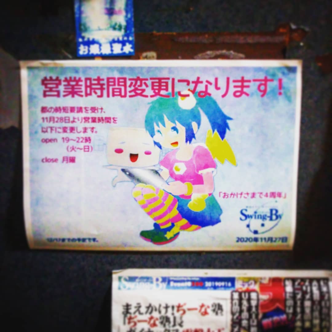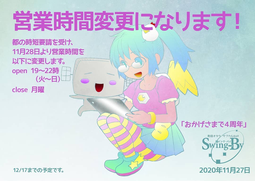 【営業時間変更のお報せ】11/28より営業時間変更になります!都の時短要請を受け、11月28日より営業時間を以下に変更します。open:18~24時(火~日)/close:月曜。※12/17までの予定です。2020年11月27日 「おかげさまで4周年」オタク・サブカルBAR Swing-By 店長・雷門風太 #オタクバー #新型コロナウィルス