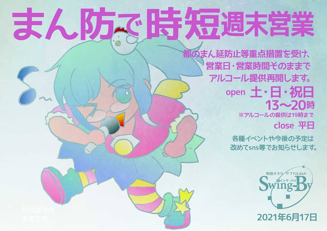 【まん防で時短週末営業のお報せ】都のまん延防止等重点措置を受け、営業日・営業時間そのままでアルコール提供再開します。open:土・日・祝日 13~20時 ※アルコールの提供は19時まで close:平日 各種イベントや今後の予定は改めてsns等でお知らせします。 2021年6月17日 町田オタク・サブカルBAR Swing-By 店主 雷門風太 #オタクバー #新型コロナウィルス