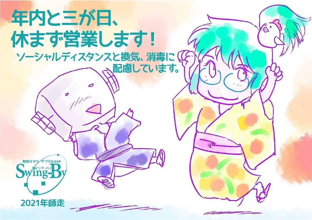 ※画像間違えてたので再アップ【年末年始営業】年内と三が日、休まず営業します! ソーシャルディスタンスと換気、消毒に配慮しています。2021年師走 町田オタク・サブカルBAR Swing-By 店主 雷門風太 #オタクバー
