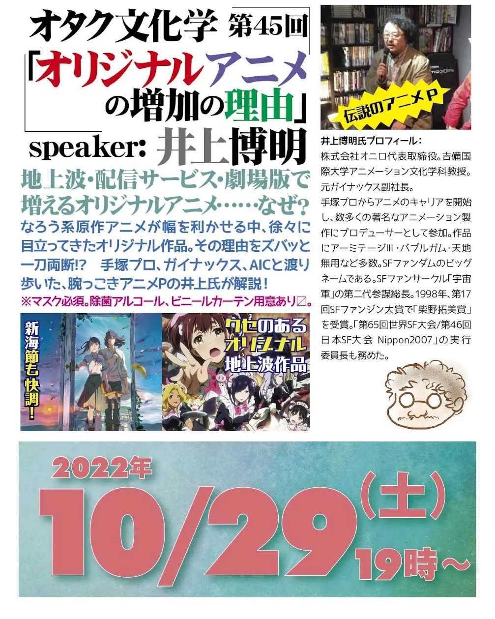 '22 10/29 #オタク文化学 第45回「#オリジナルアニメ の増加の理由」https://bit.ly/3TBq8kk 19時~ 2,000円(1drink付)speaker: #井上博明地上波・配信サービス・劇場版で増えるオリジナルアニメ……なぜ?#なろう系原作アニメ が幅を利かせる中、徐々に目立ってきたオリジナル作品。その理由をズバッと一刀両断!? #手塚プロ、#ガイナックス、#AIC と渡り歩いた、腕っこき #アニメP の井上氏が解説!※マスク必須。除菌アルコール、ビニールカーテン用意あり〼。。プロフィール: 株式会社オニロ 代表取締役。 #吉備国際大学 #アニメーション文化学科 教授。元ガイナックス副社長。手塚プロから #アニメ のキャリアを開始し、数多くの著名な #アニメーション製作 に #プロデューサー として参加。作品に #アーミテージ・#バブルガム・#天地無用 など多数。#SFファンダム のビッグネームである。#SFファンサークル「#宇宙軍」の第二代参謀総長。1998年、第17回 #SFファンジン大賞 で「#柴野拓美賞」を受賞。「第65回 #世界SF大会 /第46回 #日本SF大会 #Nippon2007」の実行委員長も務めた。