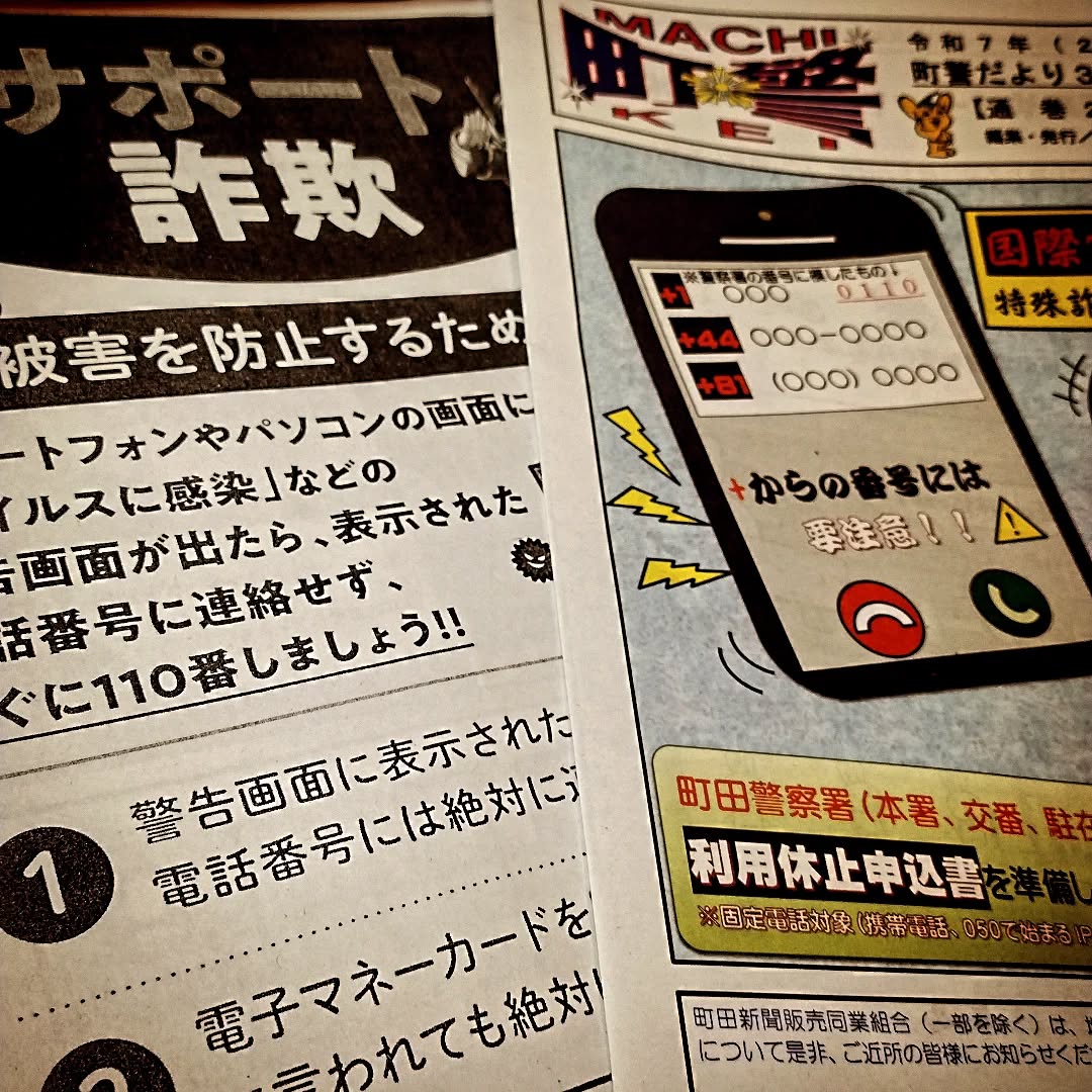 またも詐欺注意喚起!?今日も町田警察の警官が特殊詐欺のお報せチラシ持って訪問。一月ほどで3回目、電話も含めると4、5回になる。「町田だけで2億円の被害がでています」(期間はど忘れ)警察の人、お疲れ様です!#特殊詐欺 #特殊詐欺撲滅キャンペーン #町田警察 #町警だより #サポート詐欺
