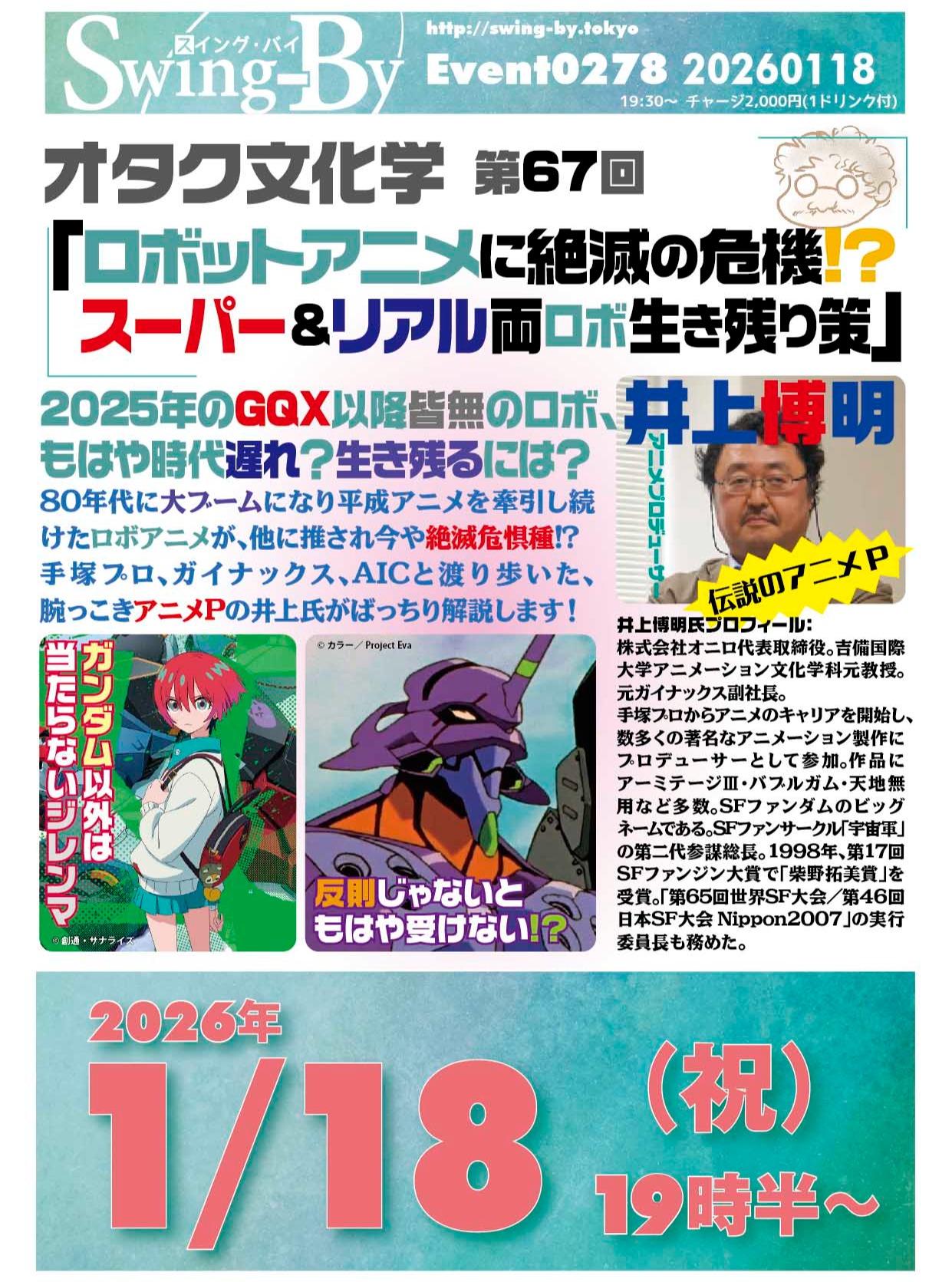 '26 1/18 オタク文化学 第67回「ロボットアニメに絶滅の危機!? スーパー&リアル両ロボ生き残り策」https://bit.ly/49sYVJN19時半~ 2,000円(1drink付)アニメプロデューサー: 井上博明進行: 雷門風太2025年のGQX以降皆無のロボ、もはや時代遅れ?生き残るには?80年代に大ブームになり平成アニメを牽引し続けたロボアニメが、他に推され今や絶滅危惧種!?手塚プロ、ガイナックス、AICと渡り歩いた、腕っこきアニメPの井上氏がばっちり解説します!井上博明: 株式会社オニロ 代表取締役。吉備国際大学アニメーション文化学科元教授。元ガイナックス副社長。手塚プロからアニメのキャリアを開始し、数多くの著名なアニメーション製作にプロデューサーとして参加。作品に「アーミテージ」「バブルガムクライシス」「天地無用!」 など多数。SFファンダムのビッグネームである。SFファンサークル「宇宙軍」の第二代参謀総長。1998年、第17回SFファンジン大賞で「柴野拓美賞」を受賞。「第65回世界SF大会/第46回日本SF大会Nippon2007」の実行委員長も務めた。雷門風太:マンガ編集デザイナー、当オタクバー店長。元ガイナックス雑兵。4コマ漫画家でデビュー、ガイナックスに編集・デザイナーとして入社。独立後はKADOKAWA、小学館、双葉社、ぶんか社などと取引。CDドラマ脚本や漫画原作も手掛ける。Nippon2007ではアートディレクション担当。#オタクバー #オタク文化学 #井上博明 #ロボットアニメ #ロボアニメ