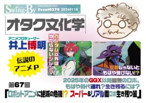 イベント詳細 日付: 2026年1月18日 19:30 – 22:30 会場: オタク・サブカルBAR Swing-By カテゴリ: オタク文化学, トークショー, 店内イベント タグ: アニメP, オタクバ … 続きを読む オタク文化学67「ロボットアニメに絶滅の危機!? スーパー&リアル両ロボ生き残り策」